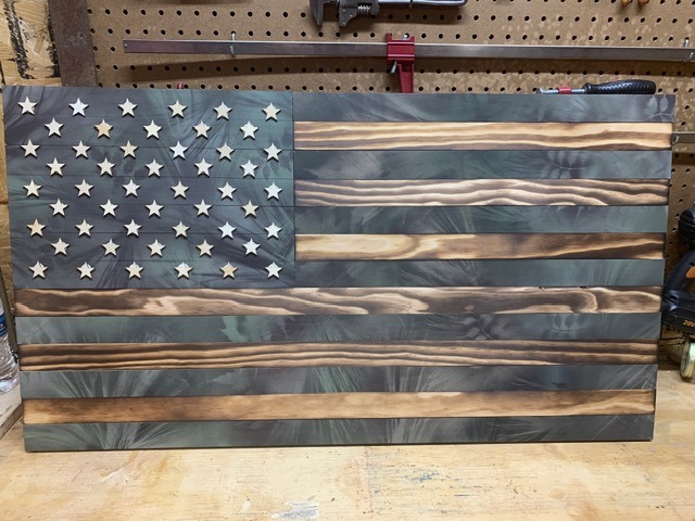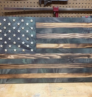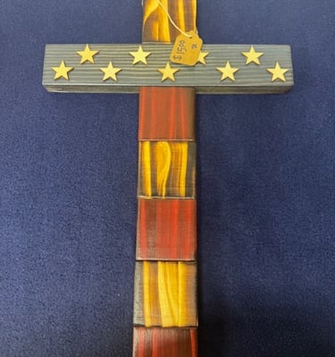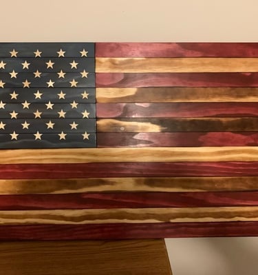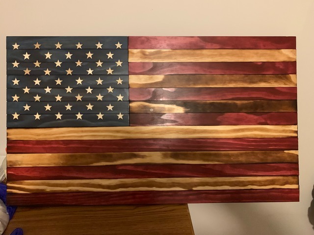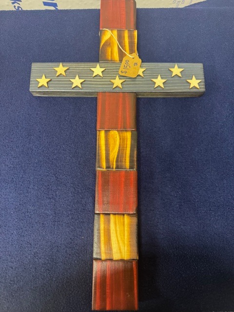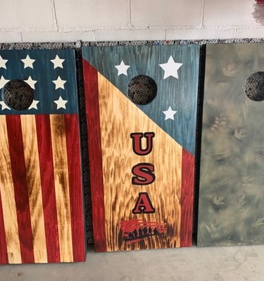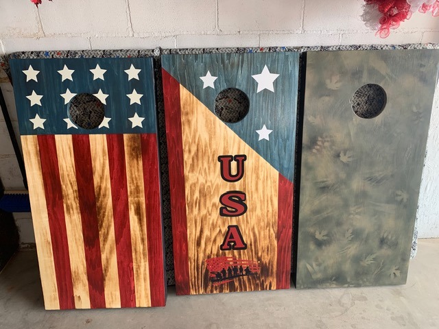 American flags, wooden crosses, and corn hole boards made with care